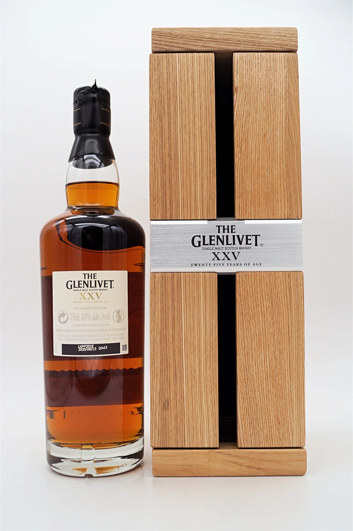 Bereits der Duft von The Glenlivet XXV erinnert an einen zugänglichen Sherry. Das Bouquet lockt intensiv, fast cremig und ist von einer harmonischen Komposition aus fruchtigen und würzigen Aromen geprägt. Am Gaumen offenbart sich zunächst ein süßer, dann kräftiger Hauch von prächtigen Gewürznoten sowie der Einfluss von Schokolade und frischen Orangenschalen. Im lang anhaltenden Abgang ist der überaus weiche Blend, der 2009 die Goldmedaille als Bester seiner Klasse gewonnen hat, trocken und würzig mit zarten Anklängen von angenehmer Süße. The Glenlivet XXV – ein ausgezeichneter Single Malt aus der Region Speyside, der während einer zweijährigen Reifezeit in Sherryfässern seine perfekte Vollendung findet.