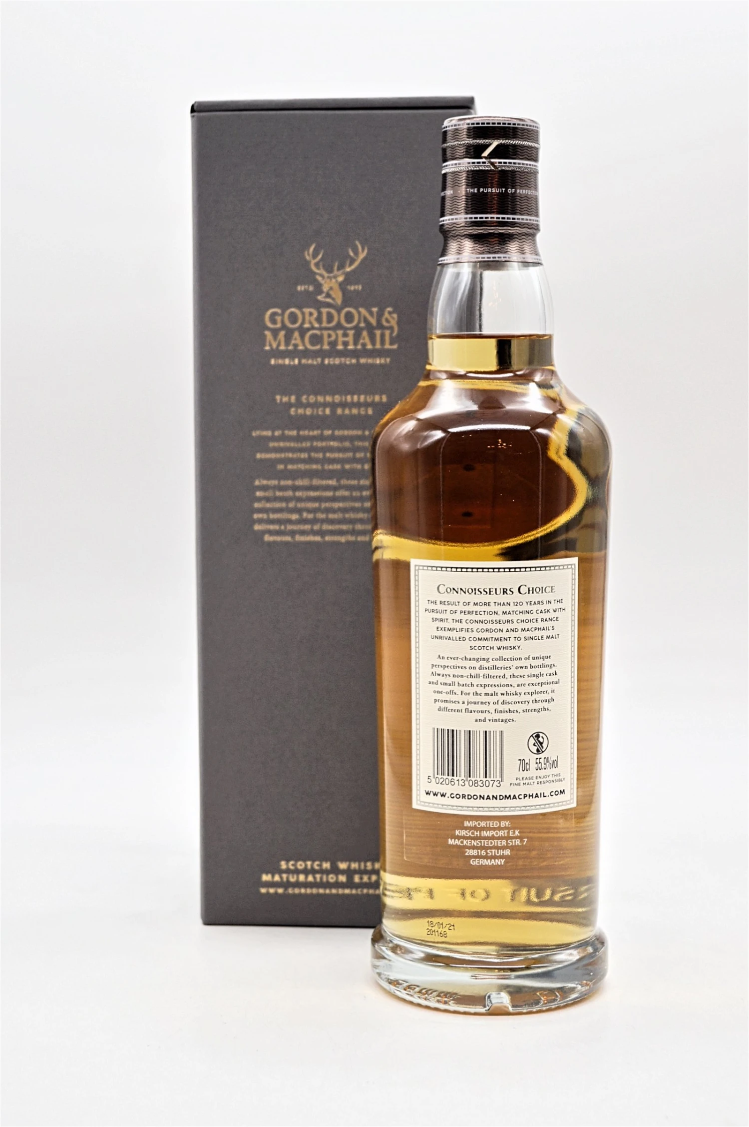 Das 1968 vom Whisky-Visionär George Urquhart gegründete Sortiment „Connoisseurs Choice“ umfasst mehr als 2.000 Abfüllungen aus fast 100 schottischen Brennereien. Die einzigartige Geschichte jedes Whiskys von ‚Connoisseurs Choice‘ wird durch sein Etikett erzählt: Fasstyp, Abfülldatum, Stärke, Jahrgang und Verkostungsnotiz.