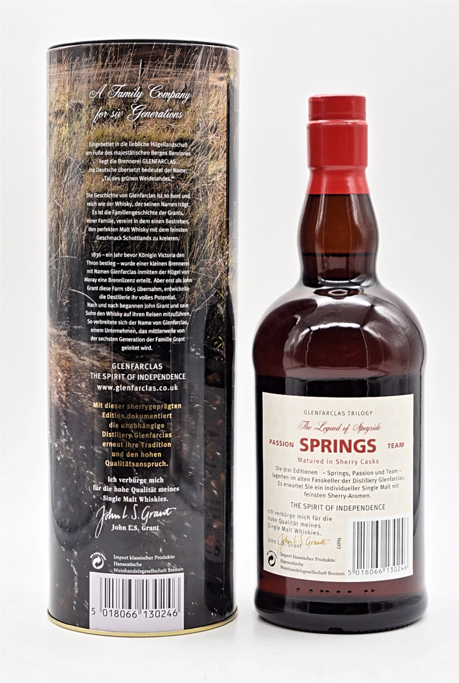 Dies ist eine Abfüllung aus der neuen Multi-Vintage-Trilogy The Legend of Speyside von Glenfarclas. Die drei verschiedenen Abfüllungen symbolisieren die Jahrhunderte alte Familientradition (Passion), die Reinheit der Natur (Springs) und das historische Handwerk (Team), die die Whiskys der Brennerei ausmachen.