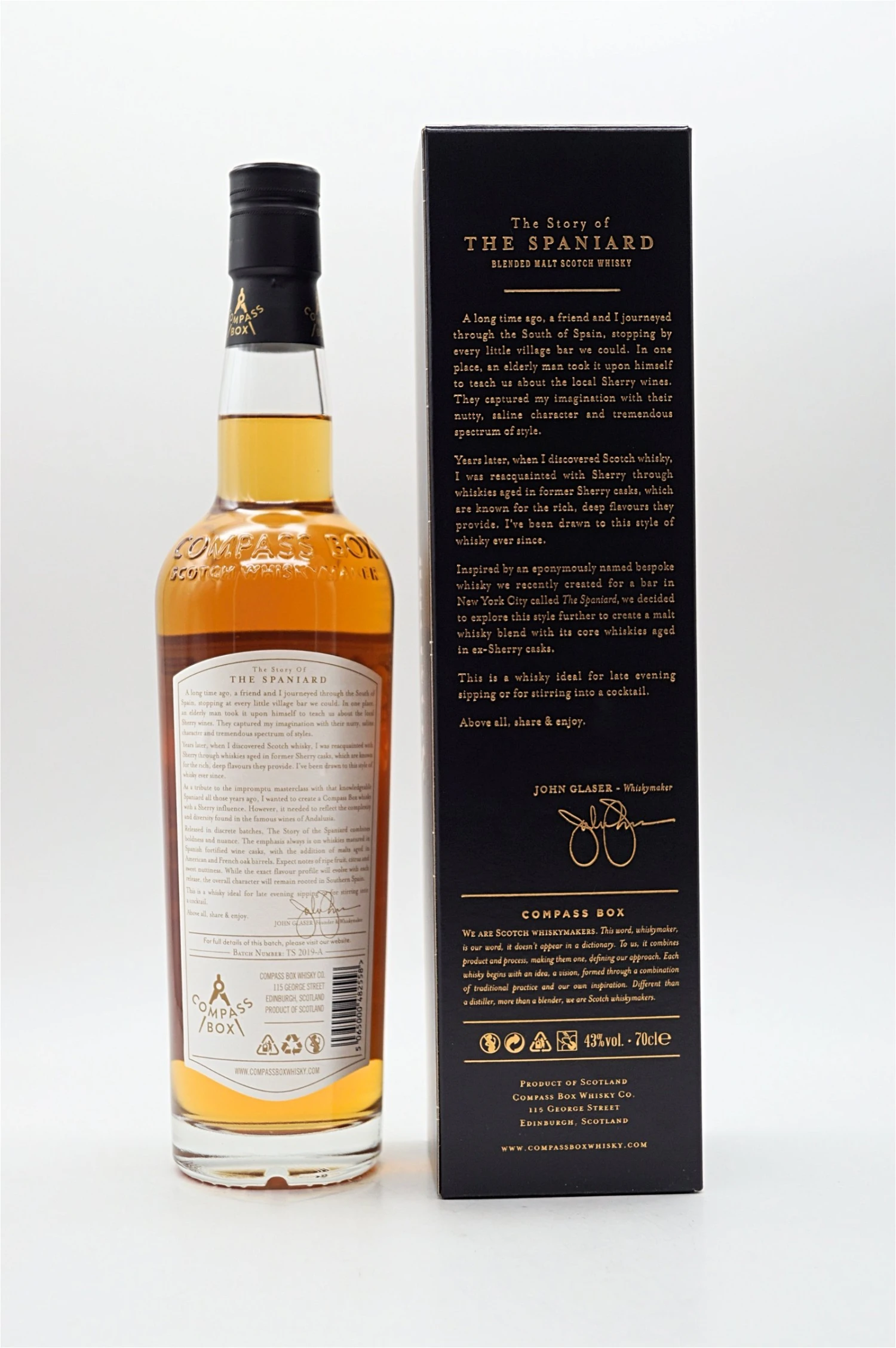 Eine üppige Malt Whisky Mischung, die Whiskys präsentiert, die in spanischen Weinfässern gereift sind. Der Name ist eine Anspielung auf die zufällige Begegnung des Gründers mit einem Mann in Südspanien, wo er Sherry zum ersten Mal kennengelernt hat. Es ist ein Whisky-Stil, zu dem John sich seitdem hingezogen fühlt. THE STORY OF THE SPANIARD erscheint in Chargen mit der auf dem rückseitigen Etikett angegebenen Chargennummer und ist eine Hommage an Sherrys breites Stilspektrum.