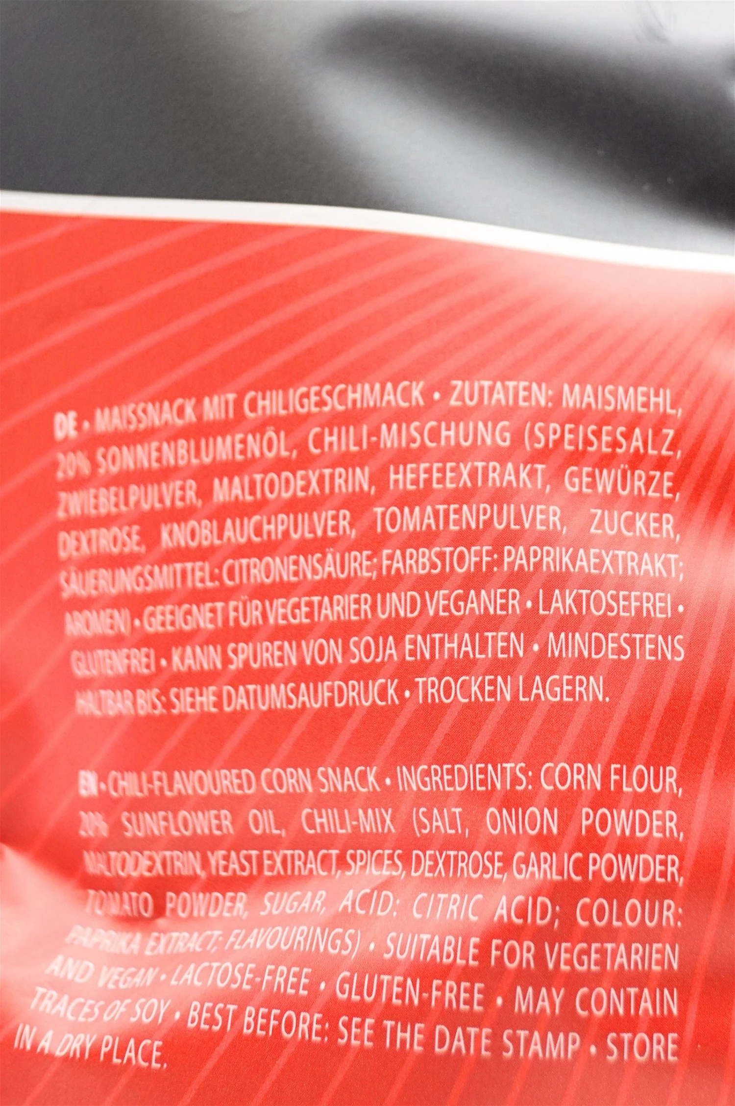 Der knusprige Snack aus Maismehl wird mit hochwertigem Sonnenblumenöl hergestellt und erhält seine Schärfe durch eine fein abgestimmte Chili-Mischung.